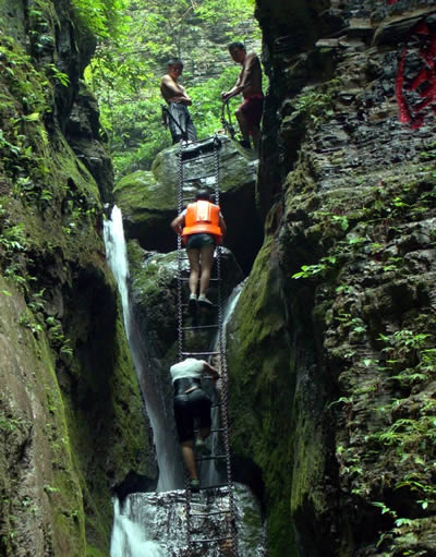 坐龍峽風(fēng)景區(qū) 坐龍峽擁有中國(guó)第一條特種游道。所有游道均建于峽谷深處,依山取勢(shì),既經(jīng)細(xì)心雕琢聽卻又渾然天成。粗樸的板栗木棧道,可以讓你零距離的親近那一潭碧幽、聽聞山泉叮咚;精巧的跳墩,可以讓你媳戲流泉、觸感溪瀑;原質(zhì)的石坎道,讓你不得不調(diào)動(dòng)全部的身心能量悉心攀援、感悟峽谷;有驚無(wú)險(xiǎn)的鐵梯,讓你伴著腳下轟鳴的溪水,在驚怵中體味一份快慰。出口處的土家山寨,保留了古樸獨(dú)特的生活習(xí)俗。一塊臘肉就一口醇香的“苞谷燒”會(huì)讓你洗去所有的疲憊,在輕松中憨厚的主人向你講述過去強(qiáng)人出沒的故事......