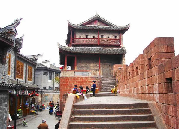 到清朝,古城的軍事地位日顯重要,先后在這里設(shè)鳳凰廳、鎮(zhèn)竿鎮(zhèn)辰沅永靖兵備道治所,古城的建設(shè)也得到加強(qiáng)?滴跷迨哪辏1715年)遂將磚城改建為石城,北門定名為“壁輝門”,一直保存至今。北門古城樓采用本地紅砂條石筑砌,做工考究,精鉆細(xì)琢。城門呈一半月拱,有兩扇鐵皮包裹。圓頭大鐵釘密鉚其上的大門。城樓用青磚砌筑,重檐歇山頂,穿斗式木結(jié)構(gòu),石座卷頂。城樓對外一面開槍眼兩層,每層4個(gè),能控制防御城門外一百八十度平面的范圍。北門城樓與東門城樓之間城墻相連,前臨清澈的沱江,既有軍事防御作用,又有城市防洪功能,形成古城一道堅(jiān)固的屏障,雖幾經(jīng)戰(zhàn)火,仍巍峨聳立于沱江河岸。