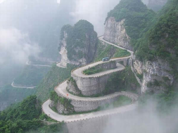 張家界天門山盤山公路有"通天大道"之稱,盤山公路全長10.77公里,海拔從200米急劇提升到1300米,大道兩側絕壁千仞,空谷幽深,共計99個彎,180度急彎此消彼長,似玉帶環(huán)繞,彎彎緊連,層層迭起,被譽為“天下第一公路奇觀”。