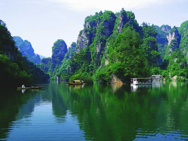 寶峰湖瀑布 湖中有兩座疊翠小島,近岸奇峰屹立,峰回水轉(zhuǎn)。泛舟漫游,只見(jiàn)一湖綠水半湖倒影,充滿(mǎn)詩(shī)情畫(huà)意。“云梯萬(wàn)丈上天臺(tái),高峽平湖一鑒開(kāi),王母瑤池金扶,浣沙仙女下凡來(lái)”游寶峰湖,你就會(huì)欣賞到這樣的詩(shī)情畫(huà)意。群峰擁抱的寶峰湖,長(zhǎng)約2.,5公里,湖猶如一面寶鏡,四面青山,一泓碧水,蕩槳溫游,格外愜意。坐在船上,環(huán)顧四周,千山聳翠,俯視水中,倒影慢移,碧水照相館得群峰綠,人面桃花水映紅。真是靜極了,美極了!韓劇《九天洞》拍攝的湖水就是寶峰湖。