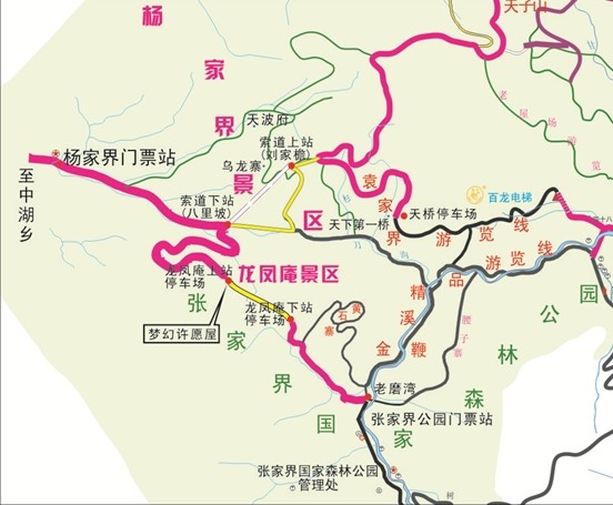 龍泉瀑布-楊家界風光 3、中湖門票站進 中湖門票站——索道下站八里坡停車場:(乘車)15分鐘 楊家界索道運行時間5分鐘 索道上站——劉家檐停車場:(步行)5分鐘 劉家檐停車場——袁家界天橋停車場(乘車)10分鐘 劉家檐停車場——天子山停車場(乘車)25分鐘
