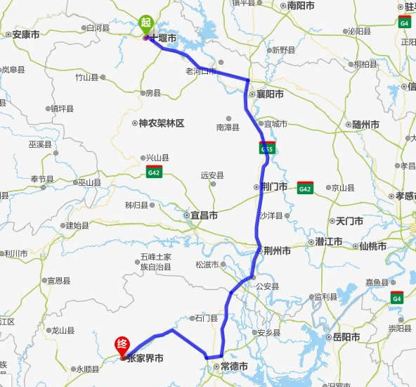 左右,沿途經過十堰市——老河口市——襄陽市——荊門市——荊州市——公安縣——常德(也可以走國道經澧縣、石門縣)——慈利——張家界。